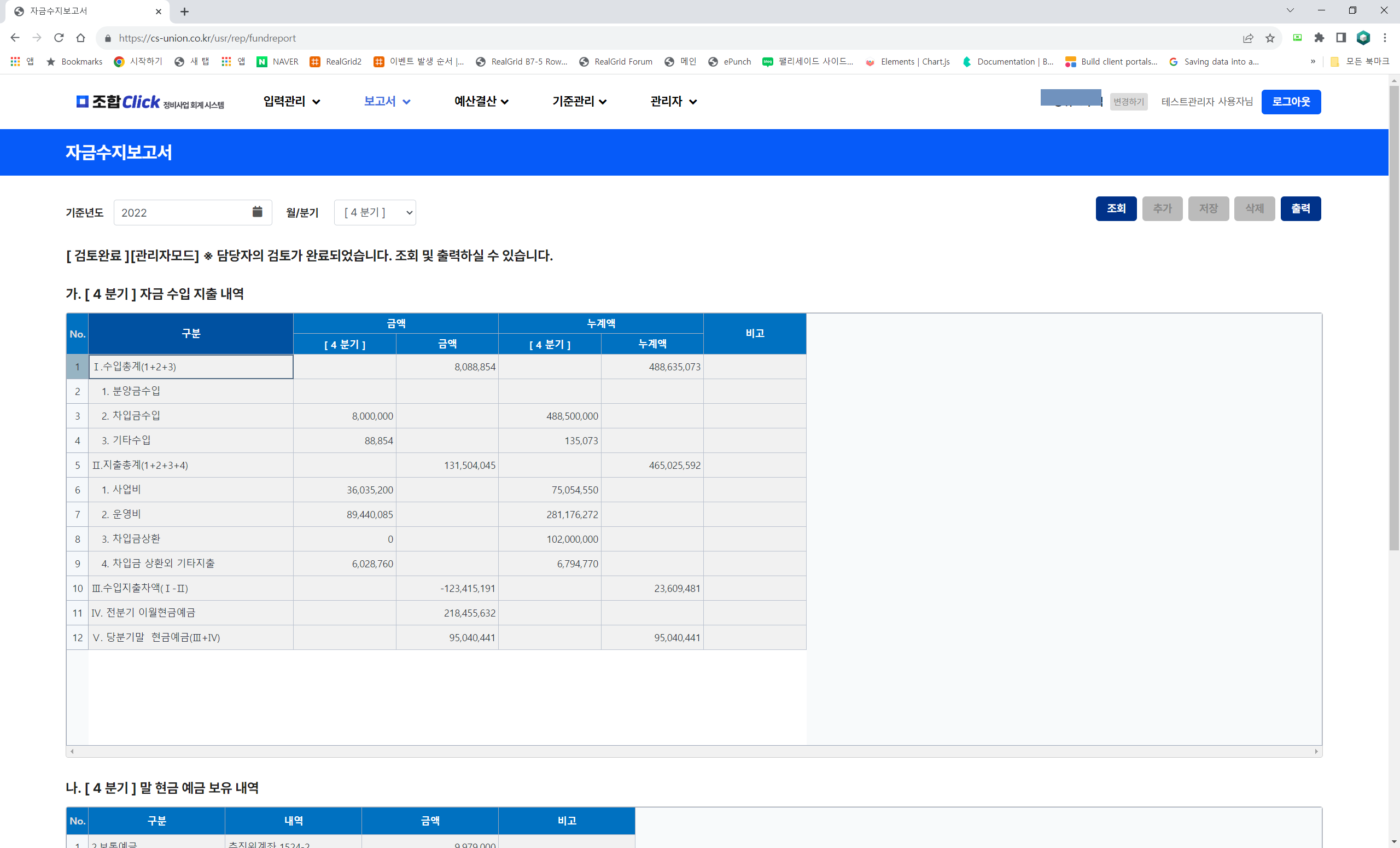 자금수지보고서, 자금수지계산서가 조회 및 출력이 가능합니다.