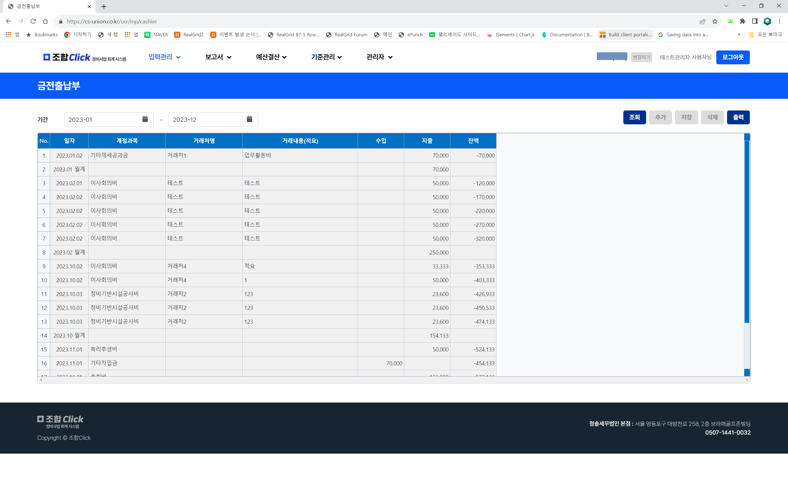 시작년월과 종료년월을 선택하여 금전출납부를 조회하고 출력할 수 있습니다.